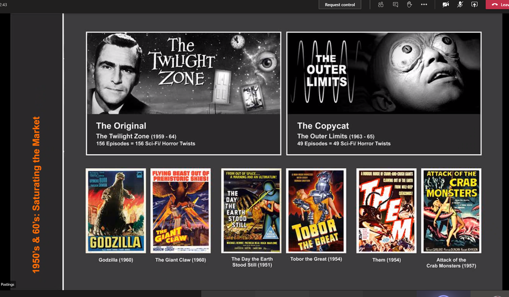 The 1950's enable a access to multiple genres and the boom home TV sets. This shift in technology meant that cinema's where no longer special, meaning more was needed to bring in a viewership and continue to make money. Shows such as the Twilight Show, Dragnet and Dr Who become massive stories that ran over long periods, captivate its audiences. However, plot twist features and sci-fi shows saturated the market. This brought about a new production ear, the "Knock-Off".
